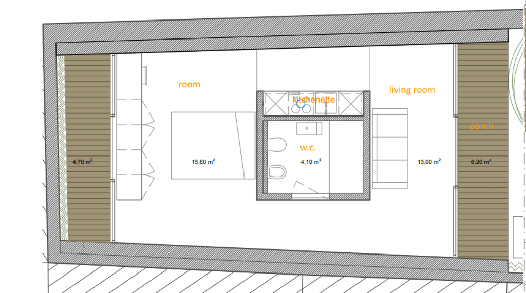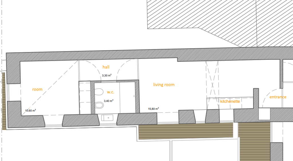 This is an one-bedroom suite (apt.) on the ground floor in garden with a 45m2 area that include a kitchenette and living-room, bathroom with shower, a small deck.