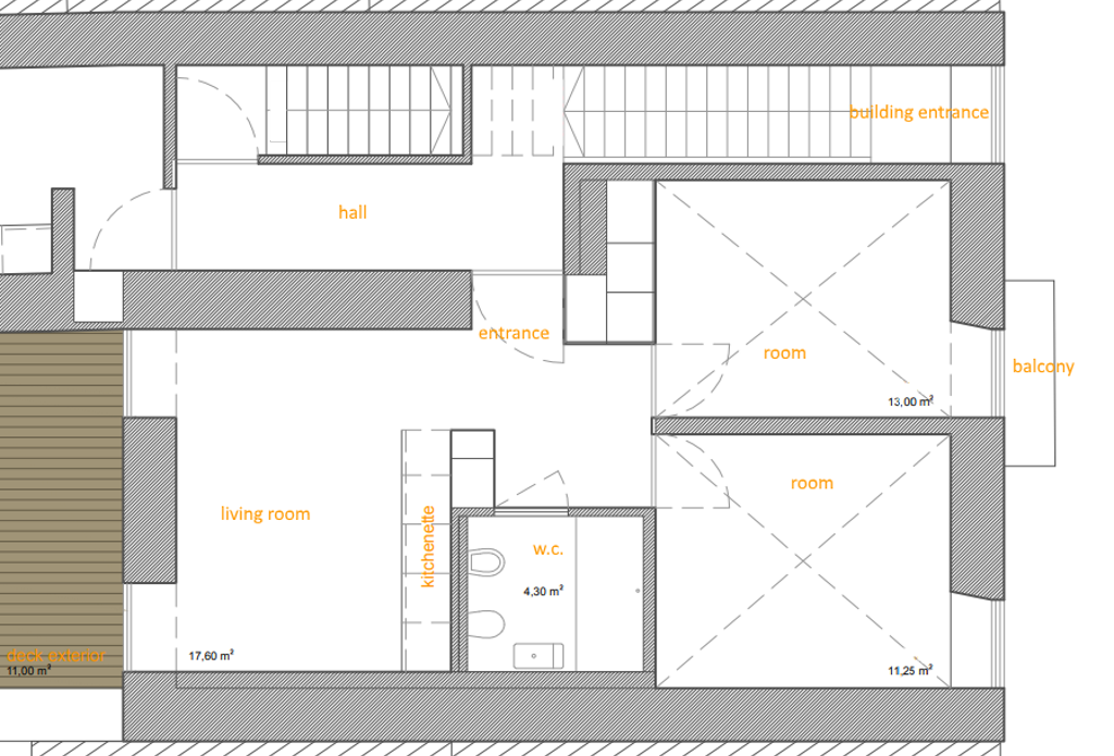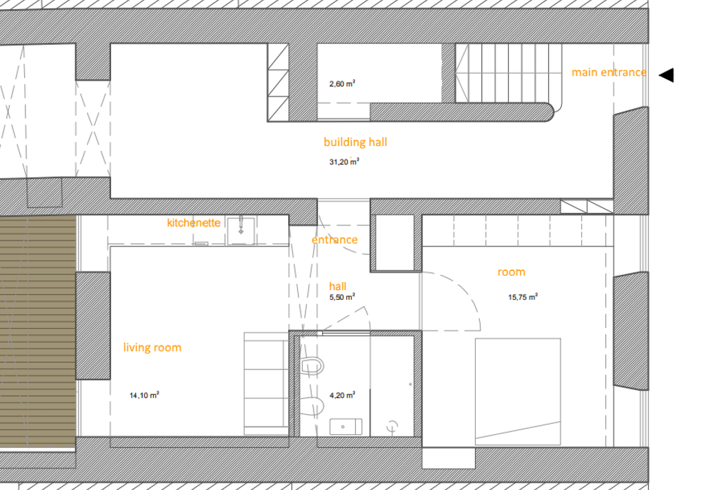 This is an one-bedroom suite (apt.) on the last floor with a 65m2 area that include a kitchenette and living-room, bathroom with shower.